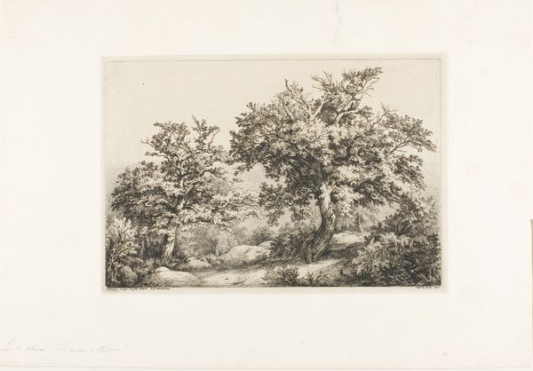 Curator: Look at the quiet intensity in Heinrich Buntzen's "Egetraeer ved en so," translated as "Oak Trees by a Lake," created in 1859. Editor: My immediate impression is melancholy. The monochrome and delicate etching work contribute to this, suggesting a tranquil scene also touched by loneliness. Curator: Indeed. Trees are perennial symbols of life, endurance, and connection between heaven and earth in so many cultures. An oak, in particular, signifies strength, resilience, even ancient wisdom. Here, by the lake, do you feel these archetypes are in play? Editor: The rendering feels interesting. Given the methods employed—lithograph, etching, and possible pencil drawings—it strikes me as almost proto-photographic in its desire for detail, mimicking the precise textures of bark, leaf, and water. Curator: That's a perceptive point! Consider how realism in landscape, at this time, intersected with growing scientific understanding of the natural world, along with cultural nostalgia for pastoral life being threatened by industrialization. Editor: And we should think about Buntzen's choices, materially speaking. These printing techniques—etching especially—required highly specialized tools and skill, pointing to an interesting tension between mechanical reproduction and painstaking handcraft. I'm fascinated by that interplay. Curator: The figure in the boat introduces another layer of symbolism—voyage, introspection, the soul’s journey across the waters of life. It makes the viewer question their presence and importance in a nature setting. Editor: And the subtle texture given to that water makes me wonder about access to this scene—the leisure involved in producing and enjoying such work. Who was it made for and how did that factor into Buntzen’s choices around the landscape? Curator: Ultimately, Buntzen seems to encapsulate a specific historical yearning—to hold onto nature in a changing world, as viewed from an emerging bourgeois sensibility. Editor: It truly seems to capture both the serene beauty and, indeed, the slow and painstaking work that defined landscape at this particular time in history.