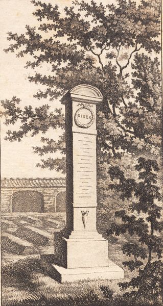 J.F. Clemens created this print called Mindestøtten for Riber using etching, a type of printmaking, in Denmark. This image, which depicts a monument surrounded by trees, is likely a tribute to someone or something significant to the town of Ribe. In eighteenth-century Europe, monuments and memorials were becoming increasingly popular as ways to express national identity and civic pride. The clean, classical lines of the monument, combined with the wreath, evoke a sense of order and rationality, values that were central to the Enlightenment. To understand this work more fully, you might research the history of Ribe and the figures associated with it. Were there particular events or individuals that shaped the town's identity during this time? Also, considering the status of Clemens as an artist working in Denmark, what was the role of art institutions in shaping national identity at this time?