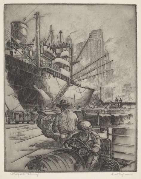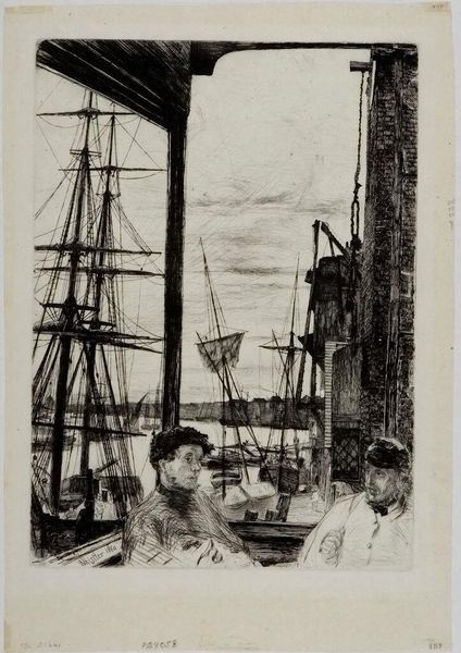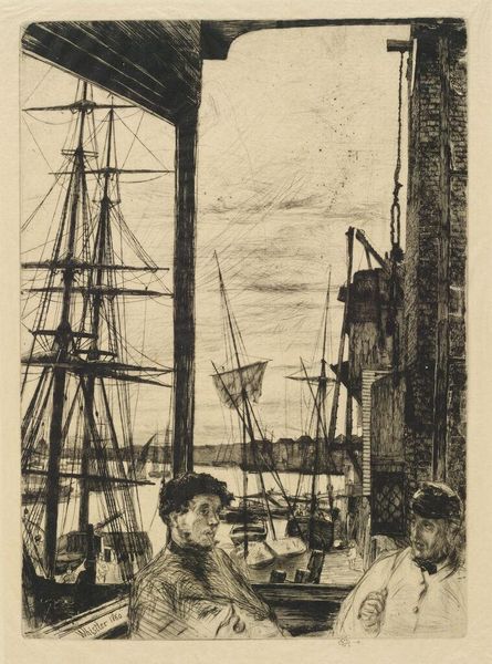 Curator: Here we have James Abbott McNeill Whistler's "Rotherhithe" from the collection of the Harvard Art Museums. It’s an etching, and quite a striking one at that. Editor: I get a sense of a bygone era, a foggy memory of old sailors and creaking docks. The mood is so thick. Curator: Note the strategic use of drypoint to achieve those rich blacks, particularly in the foreground figures and the architectural framing. The formal structure is all about contrasts. Editor: The two men seem lost in their own worlds. The layering of detail makes it feels intimate but remote, like glimpsing a story through a rain-streaked window. Curator: Whistler masterfully employs line to suggest depth and atmosphere, creating a complex interplay between the industrial and the personal. Editor: It’s a beautiful rendering of a working waterfront, and the characters in the foreground really pull you in. I’m left wondering about their stories, their world. Curator: Indeed, it's a fascinating example of Whistler's aesthetic approach, melding technical precision with evocative imagery. Editor: I feel ready to set sail. Thank you.