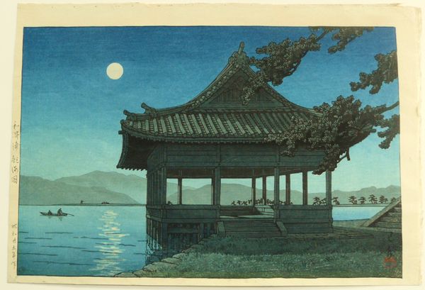 Curator: This woodblock print from 1928 is titled "Starlit Night, Miyajima" and was created by Hasui Kawase. Editor: Ooh, it's giving me this serene, hushed feeling. Like being the only one awake in the world, watching the stars shimmer. It’s a simple scene, but really mesmerizing. Curator: The composition guides the viewer’s gaze upward, doesn’t it? Starting from the stone lantern, tracing the torii gate's reflection, and culminating in those subtle stars in the indigo sky. Kawase really understands how to structure pictorial space. Editor: Absolutely. It's not just a pretty picture, there is almost a musical quality, you know? That gate standing in the water – it’s like a visual chord, all stillness and quiet power. Like a place between worlds, really. Curator: Indeed. Note also how the artist has masterfully rendered textures, contrasting the solidity of the stone lantern with the fluid reflections on the water’s surface, using precise lines and subtle gradations of color. This attention to detail is really characteristic of the Shin-Hanga movement. Editor: Those details are so gorgeous and I can see that for sure. I find myself wondering about the solitary figure who lit that lantern. Were they contemplating the infinite? Or just trying not to trip? Curator: While it is hard to be sure, I believe it underscores a deeper cultural reverence. Night scenes were common in Ukiyo-e tradition and are thought to suggest introspection, and appreciation of transient beauty. Editor: It’s interesting to realize how a single piece like this combines craft, structure, and this undercurrent of deep feeling. It definitely stuck a chord with me! Curator: Absolutely. Hopefully this glimpse has encouraged you to appreciate this artwork’s carefully balanced composition as well as its historical contexts.