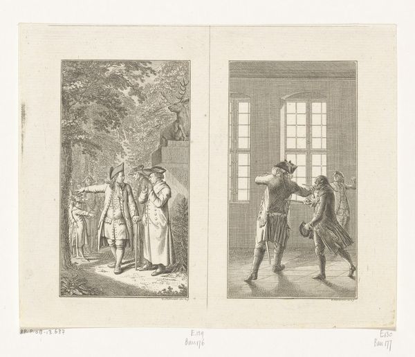 Curator: Here we have Daniel Nikolaus Chodowiecki's engraving from 1779, "Skelet van de minnaar in een vitrinekast en kelk waaruit bloemen groeien"— "Skeleton of the lover in a display case and chalice from which flowers grow." Editor: The two scenes separated on a single sheet create an immediate contrast: claustrophobia versus austere emptiness, complexity against brutal simplicity. Curator: Precisely. Chodowiecki manipulates the composition quite deliberately. Notice how the heavy lines of the architecture in the scene on the right box in the figures, creating an oppressive mood, quite distinct from the adjacent panel. Editor: Yes, but it is the symbolism that captivates me. The skeleton—vanitas, fleeting nature—in a vitrine speaks to doomed, contained romance, like a reliquary. It stands against the potential for growth embodied in the blooming chalice in panel two. It reads almost allegorically, as if depicting love and its transience. Curator: You focus on iconography. What strikes me is how the artist balances tonal contrasts within each scene. Note how, in the left image, a candle is deployed almost theatrically to create dramatic contrasts that direct your gaze, animating otherwise mundane forms with almost baroque flair. Editor: Undoubtedly. Candles carry immense cultural weight—illumination, guidance, but also burning passion. Look at the scene on the right: Two figures meet near what appears to be a tomb—an open box. Perhaps, it evokes something of the artist's contemporary, Piranesi, and his use of shadow and form. Death looms in the visual language of history. Curator: It’s interesting how he manages depth using etching; in particular, with the left panel’s interior perspective which, by using layered etching and shading, conveys both distance and scale masterfully. The arrangement provides, as you suggest, an opportunity to weigh meaning as well as technique. Editor: Ultimately, the engraving provides a thought-provoking glimpse into late eighteenth-century anxieties concerning life and death, love and loss. Curator: I concur, and moreover, highlights Chodowiecki's expertise with manipulating space and form to produce maximum visual effect.