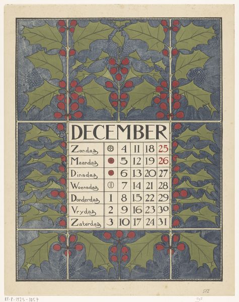 Curator: This is Anna Sipkema's "Kalenderblad januari met bloemen," a calendar page for January with flowers, predating 1904. It's a beautiful example of Art Nouveau, made with print and drawing. Editor: The floral design is quite striking! I’m interested in how it functioned as a functional object rather than just decoration. How do you approach looking at this, as an art expert? Curator: Considering Sipkema’s methods, we need to consider the accessibility of printmaking. Unlike painting or sculpture, prints could be mass-produced and distributed widely, influencing popular taste and bringing art into everyday life. What statement, then, might be the calendar making by Sipkema on artistic creation? Editor: That’s fascinating! The Art Nouveau style, with its emphasis on organic forms, feels very deliberate here, opposing industrial manufacture while employing an element of that in order to proliferate production. I'd not considered what the intersection of high art with practical item meant... Curator: Exactly. It blurs boundaries. Ask yourself, what kind of labour goes into the design itself versus the mechanical labor involved in its reproduction? It forces you to recognize how categories such as fine art, design, and craft become intertwined in practice. What else do you note about the process? Editor: I suppose the calendar's function means it would have had a short lifespan, intended for disposal once January ended. That transitory quality clashes with the seeming permanence associated with 'art'. Curator: Precisely! Sipkema provokes thoughts about materiality, utility, and the art world all at once by embracing ephemerality in a format frequently disposed of, and I can see how this analysis makes art a very vibrant, dynamic field of cultural investigation.