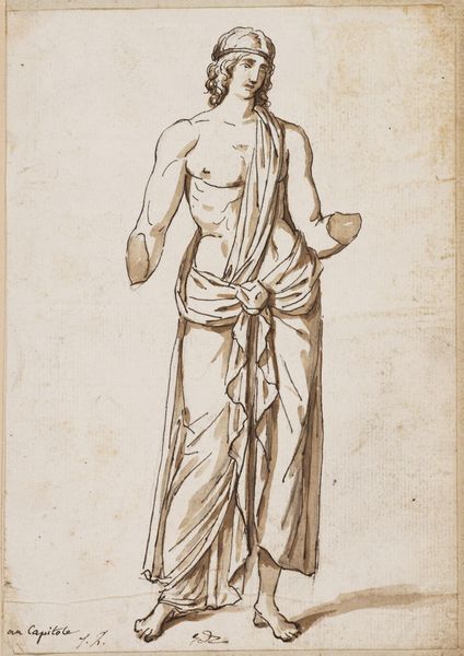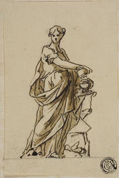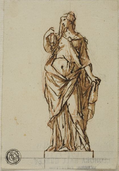 This drawing, created by John Michael Rysbrack, presents a standing female figure sketched with ink. Her raised right hand immediately catches our attention. This gesture, familiar from antiquity, speaks of rhetoric, perhaps an oath, or a call to witness. Consider how such a gesture echoes through time. We see it in classical depictions of orators, in scenes of religious pronouncements, and even in modern political rallies. The act of raising a hand becomes imbued with power, signaling authority or truth. Think of Roman emperors depicted giving speeches; the raised hand becomes a symbol of command and influence. Yet, these symbolic gestures are not fixed; their meanings evolve. The raised hand can signal blessing or condemnation. It's a fluid signifier shaped by context and intention, carrying within it a collective memory of power. This drawing serves as a powerful reminder of the cyclical nature of symbols.