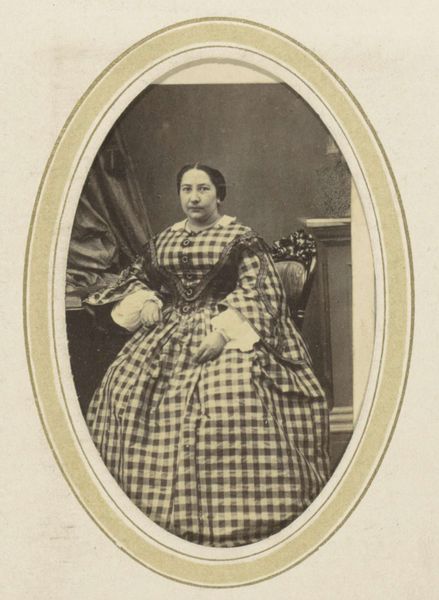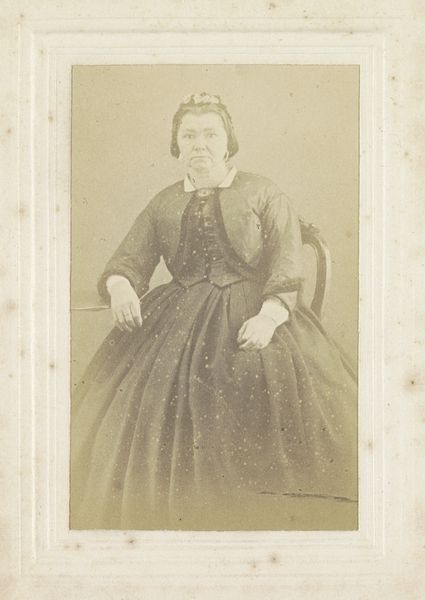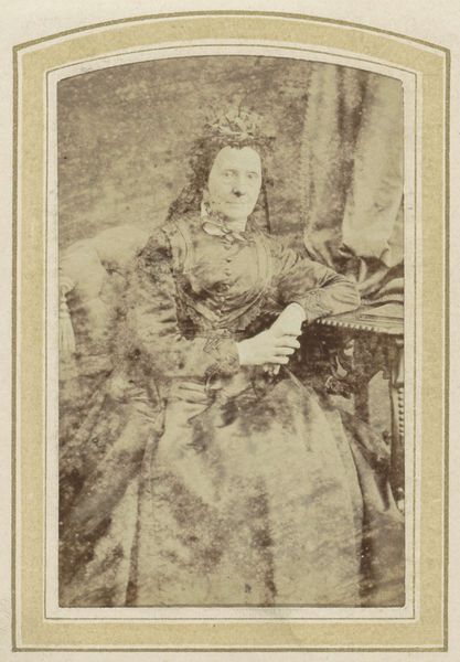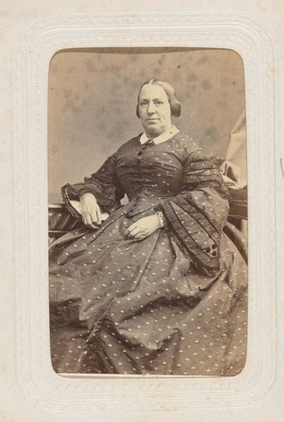 Editor: So here we have, "Portret van een zittende vrouw in een jurk met een boek in de hand," or "Portrait of a seated woman in a dress with a book in hand." It’s by the London and Continental Photographic Copying Company, dating from around 1860 to 1900. There's something incredibly still and composed about it. What do you see in this piece? Curator: Isn’t she wonderful? Immediately, I imagine a whole inner life for her, fostered by quiet afternoons and endless cups of tea, all filtered through the printed page. Those serious eyes! The slight, almost defiant, tilt of her chin! And the bows on her dress are such an overt attempt at softening her. Do you think she’s succeeding? Editor: I’m not so sure! There's something in her gaze that suggests she's utterly self-possessed despite the frills and lace. Curator: Exactly! I wonder what book she’s reading? Perhaps something revolutionary that's informing her defiant spark. I mean, look at how deliberately she holds it. Almost as if she’s displaying it as a badge of honour. Wouldn’t it be fascinating to know who this person truly was? This portrait offers so many unspoken questions about female identity in the 19th Century, about outward appearance versus inner resolve. Editor: It’s true! This image captures a moment in time but feels so timeless as well. A really good image of that intersection. Thank you! Curator: My pleasure, thinking about her really opened my own eyes!