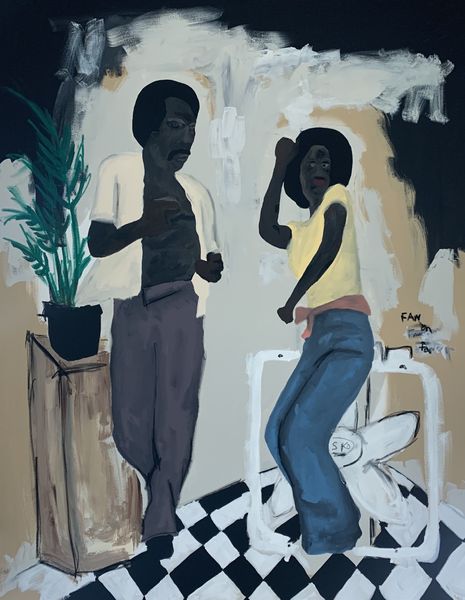 Njideka Akunyili Crosby made “5 Umezebi St., New Haven, Enugu,” a painting that's like a memory palace built with colour and collage. The palette is warm, but there are these sudden shocks of colour, like the bright orange trousers that pull the eye right into the middle of the scene. The surface is so alive! It's flat, but textured by the layers of images and paint. You can almost feel her building up the space, adding bits of memory, like she is remembering a dream, layering and distorting. It’s a really skillful blend of the personal and the historical. I think how the personal elements are collaged with fragments of photographs that act like wallpaper. The pictures on the wall create a tension between the intimacy of the domestic space and the wider world. The way she uses pattern – in the shirts, the wall – it's like the whole painting is breathing. Njideka reminds me of Chris Ofili who also explores themes of identity and diaspora in his work. Ultimately, what I appreciate most is her ability to create a space that feels both familiar and dreamlike, and how art, like memory, is always under construction.