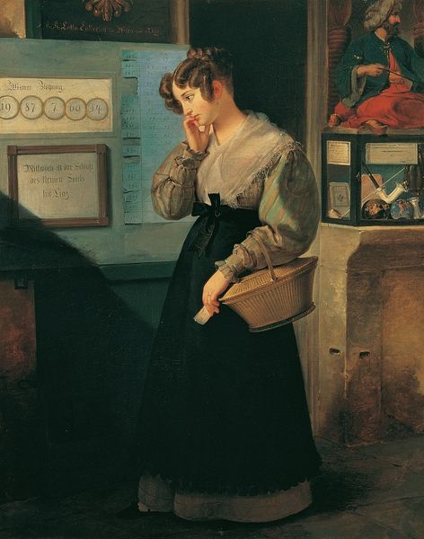 Curator: This oil on canvas, entitled "At the Railway Station," was painted around 1874 by Alfred Stevens. The scene depicts a woman seated in what seems to be a waiting room. Editor: My first thought is melancholic. The dark palette and the woman's posture suggest a deep pensiveness. The little dog offers a touch of warmth but can't quite dispel the somber mood. Curator: I agree. Let's consider this through the lens of the changing social roles of women in the late 19th century. Travel, especially solo travel, offered women a new form of autonomy. Was she traveling independently, perhaps leaving behind the constraints of domestic life? Or perhaps she has been abandoned and she's on her own because nobody loves her. Editor: The dog itself could be seen as a status symbol but beyond that, it seems symbolic of loyalty. Even though she seems heartbroken, that dog is not leaving her. Perhaps suggesting that love isn't really gone but lives with our faithful companion, like so many other symbols for relationships lost or forgotten. The train schedule in the background reinforces the sense of fleeting moments and departure. I wonder if she is departing... or waiting. Curator: Precisely! And notice the details of her attire. A plush traveling cloak, perhaps expensive, but also hinting at protection, of cloaking of true emotions... However, her ungloved hand and the fact she dabbing her brow suggest vulnerability. The railway station, then, becomes a liminal space for exploring feminine identity—between private emotion and public presentation, between constraint and agency. Her entire appearance gives clues for why this type of work of art will bring an influx of feminist interpretations during that decade and forward. Editor: A poignant observation. What I find fascinating is the continuity of such imagery. Think of other images in the modern world. Someone in tears alone or with an animal... It triggers a similar feeling, tapping into centuries of shared experience and codified symbols surrounding travel and parting. Maybe in her is this strong, emotional bond of home, of connection... which she feels the disconnection or potential of loss. Curator: Ultimately, the power of the work lies in its ambiguity, resisting simple categorization. Editor: Exactly. An enigma. What else can truly hold an emotion beyond a face and form? A painting, a sculpture—art persists when feelings leave.