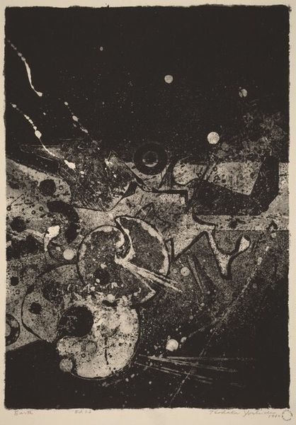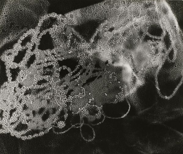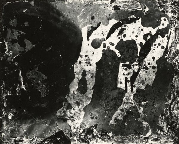 Editor: Here we have Carl Chiarenza’s “Charlestown 34” from 1976, a gelatin-silver print. Its monochrome palette and speckled texture create an intriguing yet somewhat unsettling atmosphere. What do you see in this piece? Curator: Immediately, the binary opposition of black and white establishes a visual tension. The stark contrast creates a dynamic interplay, almost a push and pull, across the picture plane. Note the distribution of light; it is not uniform. There's a clear directional force at play, an upper darkness giving way to an effervescent lower field. Editor: It’s like one state dissolving into another, isn't it? How does this calculated arrangement contribute to its overall meaning? Curator: The calculated arrangement of tonal values creates a non-representational, almost sculptural quality. Think about the materiality of the print itself – the texture of the gelatin-silver, the choices in exposure. Does this perhaps signal an inquiry into the essence of photographic language itself? Are we meant to see the surface, the medium, as much as, if not more than, a referent? Editor: So, you're saying it prompts us to look at photography beyond just capturing reality? To see the inherent properties of the medium as the message? Curator: Precisely. The artwork’s strength resides in its self-referentiality, compelling us to consider the ontological status of the photographic image. The work transcends representation, focusing instead on pure form. Editor: It is intriguing how an image seemingly devoid of recognizable forms can stimulate so much thought. I never thought of it that way. Curator: That is the magic of formalism, and the power of carefully considering what lies within the frame.