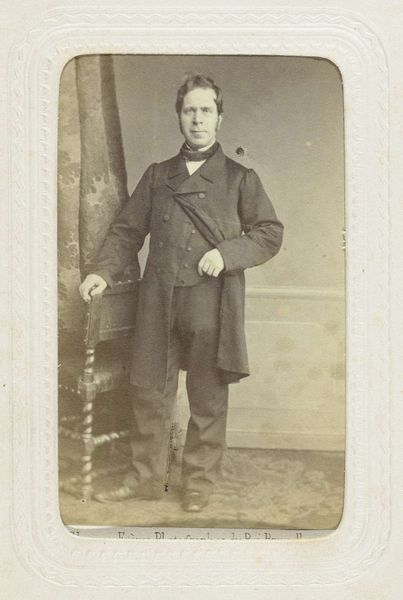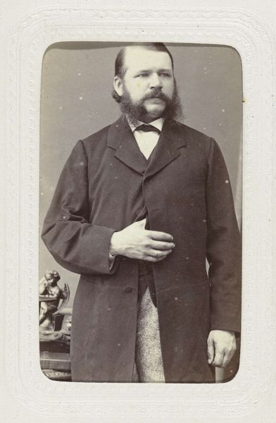 This is a photograph of a standing man next to a table by Maurits Verveer, currently held in the Rijksmuseum. The photograph is dominated by a vertical orientation, emphasizing the full-length portrait of the man. The composition is structured around a balance between the figure and the table, creating a sense of posed formality. The man's posture, with arms crossed, establishes an immediate sense of presence and self-assuredness. The tonal range is subtle, relying on gradations of sepia to define form and texture. These choices in tonality evoke a sense of nostalgia and historical distance. Viewed through a semiotic lens, the portrait presents a complex interplay of signs. The table and books suggest intellectual pursuits, while his attire signals bourgeois status. Together, the elements in the photograph function as signifiers, creating a narrative about identity, profession, and social standing. The photograph destabilizes simple readings of character by presenting the sitter as both an individual and a representative of social conventions. The formal qualities of this photograph reflect broader artistic and philosophical concerns. Note how the deliberate composition creates a stage for the sitter to perform his identity. This highlights the photograph as not merely a record, but also a construction of self within the cultural codes of the 19th century.