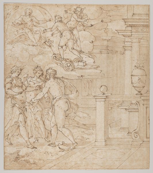 Bernardino Poccetti created this drawing, "Figure Studies," using pen and red ink in Italy in the late 16th or early 17th century. Poccetti lived in Florence during a period of intense religious and social change. The sketch presents us with three studies. We see a woman holding a shield, a dancing female, and a priest being supported at an altar before a group of onlookers. Note how the priest in the throes of religious ecstasy seems to be supported by the crowd. The sketch suggests a world where traditional religion is very much a communal activity. It may also highlight the role of women and their relationships to religious ritual. They stand with shields raised, dancing in an act of devotion. Poccetti’s drawing invites us to consider the intertwined roles of religion, gender, and community during the tumultuous Renaissance. It reminds us of the emotional intensity of religious experience and the ways in which faith can be both a personal and collective phenomenon.