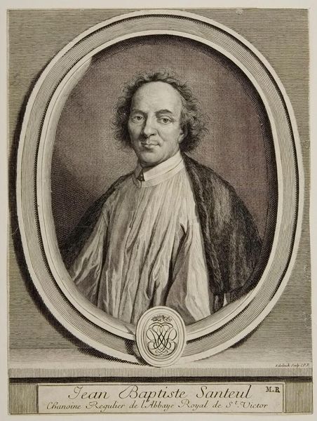 Curator: Here we have Gerard Edelinck's portrait of Jean-Baptiste Santeuil, an engraving that captures the essence of its subject within a detailed oval frame. Editor: It strikes me as a study in contrasts, really. The man's intense gaze versus the almost playful curls of his hair, the crisp lines of the engraving against the soft shadows on his face. Curator: The oval frame itself is quite symbolic. Ovals often represent a sense of enclosure, a world within a world. The medallion below, with its entwined initials, adds another layer of identity, a personal seal almost. Editor: Yes, and it certainly speaks of the time, doesn't it? A period when identity was so closely tied to symbolism and presentation. It's more than just a portrait; it's a statement. Curator: Indeed. Looking at it now, I'm reminded of how even the most carefully constructed images can still reveal something unexpected about the human spirit. Editor: Right, like a coded message from the past, that makes us think about the image's purpose and the way we approach the world.