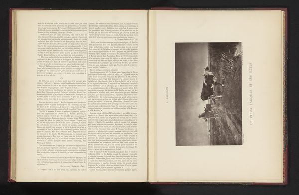 Curator: So, this gelatin-silver print, "Vrouw in een heidelandschap" or "Woman in a moor landscape" by Otto Rau, predates 1899. It's displayed as part of a book, opened to the photography, which adds another layer to its materiality. Editor: It has a stillness about it, almost like a posed tableau, but also it feels like a document of a specific place and time. What strikes you when you look at this image? Curator: For me, it's the materiality itself – gelatin silver printing. This process was not just a means to an end, but an active agent in shaping photographic aesthetics. Its development and wide adoption impacted labor, democratizing access to image-making, and how those forces affected the distribution and consumption of art and visual information. How do you see this photograph fitting into that wider social and technical picture? Editor: I suppose the wider accessibility changed photography's place. This wasn't necessarily for the elite anymore. Curator: Exactly. Photography started influencing painting and challenging established ideas about art, representation and craft. These "pictorialist" photos are not objective records but mediated, handcrafted objects despite their mechanical origins, challenging these divides. Do you notice anything that might demonstrate this aspect? Editor: Well, the soft focus almost makes it look like a painting or drawing, it does feel more artistic than documentary. I guess Rau using this new process democratized image-making in some ways. Curator: Indeed! Considering how material advancements intertwine with social change helps me understand both the artist's intention, and how an audience at the time would perceive the work. Editor: I never considered the materials of photography impacting society this much. Curator: Thinking about those things can add so much to our understanding!