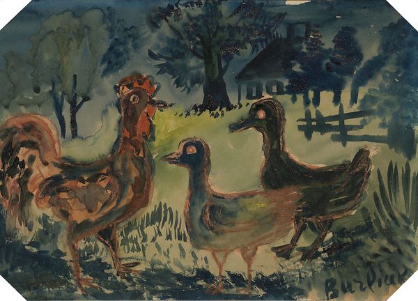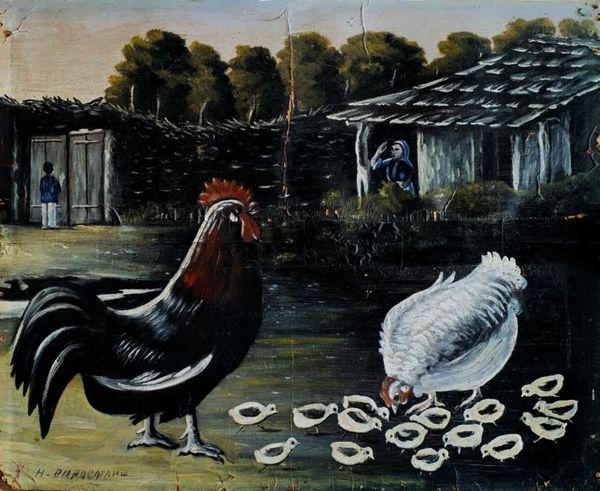 Editor: Here we have "Hen with her chicks" by Niko Pirosmani. I get a sense of rural life, something almost dreamlike in its simplicity. What can you tell me about it? Curator: Well, consider Pirosmani’s background. Born into peasant life, he was self-taught, existing outside the formal art world of his time. To me, this piece is a window into the Georgian peasant experience and the burgeoning capitalism of the time, where animal paintings were a common sign for merchants and taverns. It challenges what is defined as "fine art." Do you see a link between the direct, almost graphic style and that social reality? Editor: Yes, definitely. The lines are bold, and there's an honesty to it that feels unpretentious. The subjects, ordinary barnyard fowl, are elevated. Curator: Exactly. It questions the power dynamics inherent in art itself, by focusing on the everyday experience, outside traditional venues like museums or galleries. The hen, a mother, symbolizes fertility and nurture; however, who exactly is its family: human, or chicks, or are the two intertwined here? Editor: It makes me consider the dignity of labor, the role of women, and the complexities of family, I never would have gotten this from the image. Thanks. Curator: And notice the perspective—flattened, almost naive. What effect do you think that has on the viewer's connection to the subject matter? Editor: It creates intimacy, removing barriers between the viewer and the subjects. A nice way to question our preconceived notions. Curator: Precisely. It urges us to confront societal structures through something as basic as the imagery of domestic life. What a striking visual poem on value, family, labor and belonging.