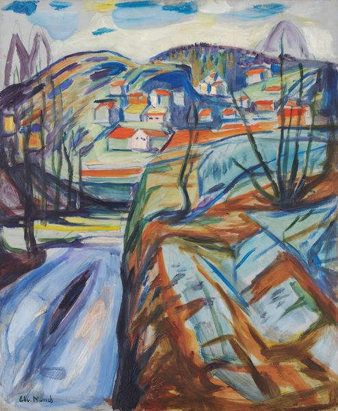 Editor: This is Peter Prendergast’s "Bethesda Quarry," a large painting held in the Tate collection. It's so vibrant. What strikes me most is the dynamic energy achieved through the broken brushstrokes and bold color choices. How do you interpret the composition? Curator: The composition presents a fascinating study in contrasting textures and spatial relationships. Notice the interplay between the jagged, angular forms of the quarry and the fluid, almost lyrical quality of the sky. How does this juxtaposition affect your reading of the work? Editor: It makes the harshness of the quarry seem almost…dreamlike. Curator: Precisely. Prendergast masterfully uses color to disrupt conventional perspective, flattening the pictorial space and emphasizing the materiality of the paint itself. The heavy impasto further reinforces this tension between representation and abstraction. Editor: I see that now. It's less about depicting a quarry and more about the act of painting itself! Curator: Indeed. Reflecting on this, we understand Prendergast’s painting not as a window onto the world, but as an object in its own right. Editor: I’ll definitely view painting with new eyes now.