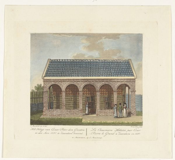 Curator: Welcome to the Rijksmuseum! We're standing before a captivating engraving, "Het Tsaar Peterhuisje te Zaandam, 1697," dating sometime between 1831 and 1899. It's an anonymous work. Editor: Yes! It's like stepping back in time. I find it fascinating how such a simple architectural structure is portrayed with such importance and detail, as it transmits tranquility and a sense of history. What particularly captures your attention when you view this engraving? Curator: You know, it’s curious, isn't it? The Peterhuisje, seemingly so humble, becomes monumentalised here. Look at how the artist meticulously renders each brick, each shingle. It’s more than just documentation. It's reverence. Perhaps for Peter the Great himself, and maybe, just maybe, a commentary on the power of humble beginnings. Do you think the artist saw the structure as a symbol? Editor: It must have! It’s funny you mention power in humble beginnings; Peter the Great worked as a carpenter here in Zaandam! So what did Peter see in Zaandam? Curator: A chance to learn, away from the constraints of court! And Zaandam offered world-leading shipbuilding. That unassuming cabin offered a crucial chapter in his transformation. Now, about the image… Look at the way the flag almost whispers in the wind, just above that stark little house... that to me makes this image sublime, but, on the other hand, there's an awful lot of realism in its rendering. Do you think that clash works well? Editor: Hmm, good point. Maybe the sublime exists because of its relation to the mundane! Well, I really didn't think I'd connect so deeply with an architectural print today! Thanks for sharing your view. Curator: The pleasure's all mine. It’s these conversations, these shared reflections, that truly bring art to life, don’t you think? It transforms the viewer as well.