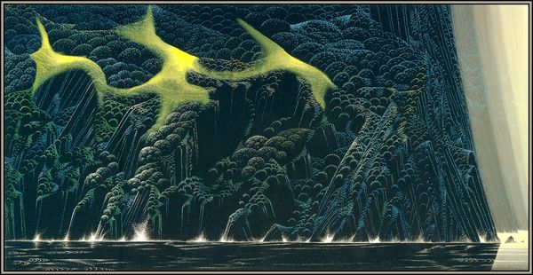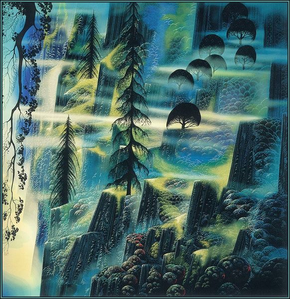 Curator: Look at these layers of cliffs cascading into the ocean, almost like steps carved from stone! Editor: I am struck by its dreamlike quality. It is intensely beautiful, with that surreal, almost hallucinatory quality. The composition is bold and unique. Curator: This acrylic painting from 1991 is entitled "Ocean Cliffs," and it is the creation of Eyvind Earle. The artist embraced fantasy and romanticism. You will notice there is something reminiscent of Post-Impressionism in the highly stylized cliffs and foliage, too. Editor: Absolutely, and thinking about the method... I wonder about the effect of such carefully rendered lines, juxtaposed with areas of softer color gradations. He makes great use of linear perspective and form here! How were paintings such as "Ocean Cliffs" fabricated, consumed, and understood? It also resembles classic Chinese landscape painting. Curator: Indeed. We see these rhythmic patterns, this layering of elements; they point to mass production but also recall traditional artistry. In what contexts and for what buyers was this created? Was Earle mass producing, or pursuing perfection? The very act of making this painting suggests that he aimed to merge these concepts. Editor: Perhaps. From a formal point of view, consider how Earle contrasts the darkness of the rocks and the dense, shadowy trees with that spray of foam on the waves. A formalist interpretation appreciates it for its organization of color, line, and composition. Curator: "Ocean Cliffs" strikes me as both a window onto natural beauty and a mirror reflecting social values that blur the line between manufactured and hand-wrought objects. I like the ways that art blends and shapes reality, but how it also shapes our material culture! Editor: Very insightful; these layers and the depth have certainly offered a new appreciation for art.