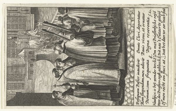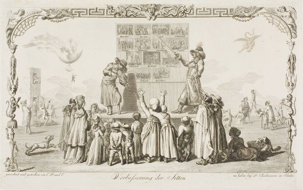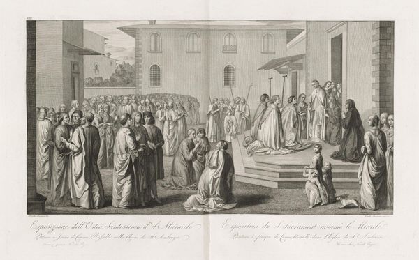 Editor: This is "Crucifixion of Saint Peter" by Conte Carlo Lasinio, housed at the Harvard Art Museums. The stark contrast in the etching really grabs you. What compositional choices strike you most? Curator: The artist's calculated use of line and form constructs a narrative of duality. Observe the spatial organization: the left panel, dominated by the stark imagery of the crucifixion, contrasts with the right panel, where figures engage in what appears to be theological discussion. Editor: So the composition itself is telling a story? Curator: Precisely. The linear precision isolates the figures, emphasizing their individual roles in the unfolding drama. Note how the stark white space amplifies the emotional weight of the scene. Editor: I see, the lack of color almost forces you to focus on the lines and shapes. Thanks, this was insightful! Curator: Indeed. Considering how form and line work in tandem provides us with a deeper understanding.
