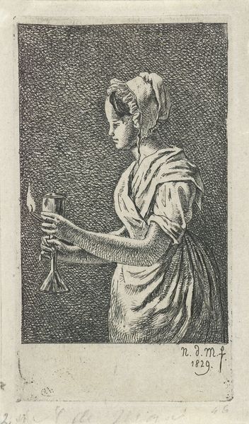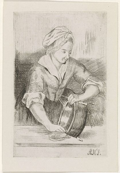Curator: This etching by Louis Bernard Coclers, titled "De ketelschuurster" or "The Pot Scourer," dates back to 1780. It's a small genre scene, executed with fine lines and a focus on the everyday life of the working class. Editor: There's something very intimate about it, isn't there? Almost like catching a fleeting glimpse into someone's private moment. The monochromatic palette makes it feel quite contemplative, almost melancholic. Curator: The piece engages with notions of labour and gender. What does it mean to represent a woman engaged in domestic work within a society still grappling with the ramifications of Enlightenment thought and its impact on social structures? The artwork is a form of early social realism, situating women within broader narratives. Editor: True, but it's more than just social commentary for me. Look at how Coclers uses line! So delicate, almost feathery, yet they create a palpable sense of depth. And the way the light falls across her face… it gives her an almost saintly quality. Cleaning pots – pure devotion! Curator: I can't help but consider the historical implications of this type of representation. It's worth noting that images of working women were not always meant to be celebratory; they often reinforced societal expectations and stereotypes about women's roles within the domestic sphere. This print exists within, but also challenges, those parameters. Editor: Perhaps. But I feel the humanness of the piece triumphs. She's so absorbed, she’s in a trance. The small box near her on the windowsill seems to hold another layer of her life, holding more story. What does she think about? What are her hopes? Curator: Exactly! We must acknowledge her interiority as being inherently valuable and inextricably tied to her socio-economic status. This type of piece brings us closer to understanding a crucial moment in history for female social justice. Editor: It really pulls you in, doesn’t it? Such a small work, so rich with meaning. A wonderful encounter to be sure. Curator: Yes, a glimpse into both a moment in time and into the complexities of social constructs as viewed through the humanity of labor.