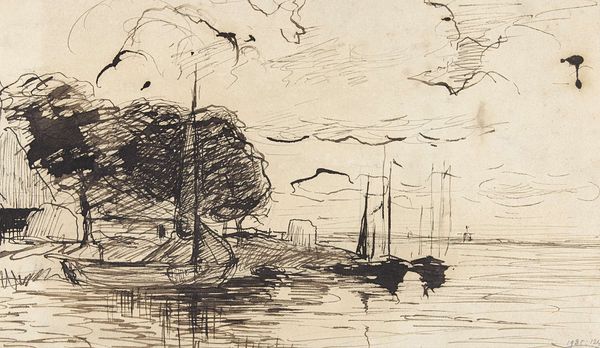 Wilhelm Kalb sketched this landscape with the Speyer Cathedral in sight, using charcoal on paper. The material itself invites a directness, a kind of immediacy. It’s not about rendering a perfect scene. Charcoal allows for quick, expressive marks; you can see the artist building up tones with smudges and broad strokes. Consider what it means to choose a material like charcoal, so elemental, so basic. It’s the residue of burned wood, something fragile and fleeting made permanent on the page. It doesn’t have the same preciousness of oils, or the high refinement of engraving. The rough quality aligns with the subject too, the natural landscape and the implied labor of those boats on the river. The drawing’s appeal lies in this tension – a grand architectural subject conveyed through humble means. It reminds us that even the most impressive achievements rest on simple foundations.
