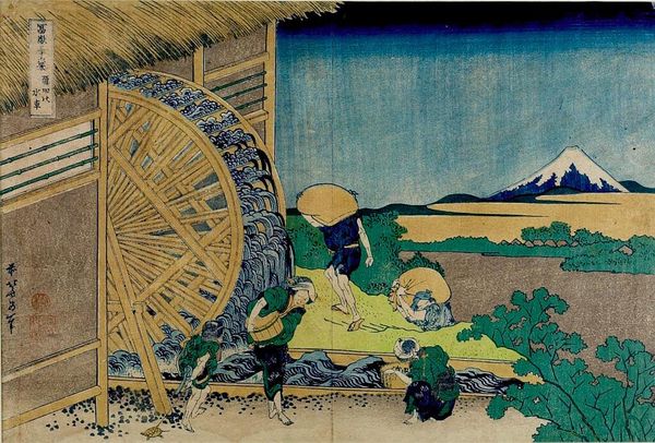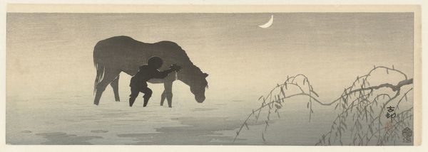 Editor: Here we have Kobayashi Kiyochika's woodblock print, "Sunrise at Hyappongui, RyÅgoku, Tokyo." It has such a lovely, tranquil mood, doesn't it? What do you see in this piece? Curator: Ah, Kiyochika, a master of light! I see a moment suspended, a sliver of dawn captured. It feels so modern, almost like a snapshot, yet rooted in the tradition of ukiyo-e. Can you sense the quiet hustle, the city awakening? Editor: I hadn’t thought about it as modern, but you're right. The rickshaw adds a human element to the scene. Curator: Indeed. And that sun, peeking through the clouds…it’s not just illumination; it's hope, a fresh start painted in delicate hues. It makes you wonder, doesn’t it, about what the new day holds? Editor: Absolutely. I'll definitely look at Kiyochika's work differently now. Curator: Wonderful. Art should always spark a new way of seeing.