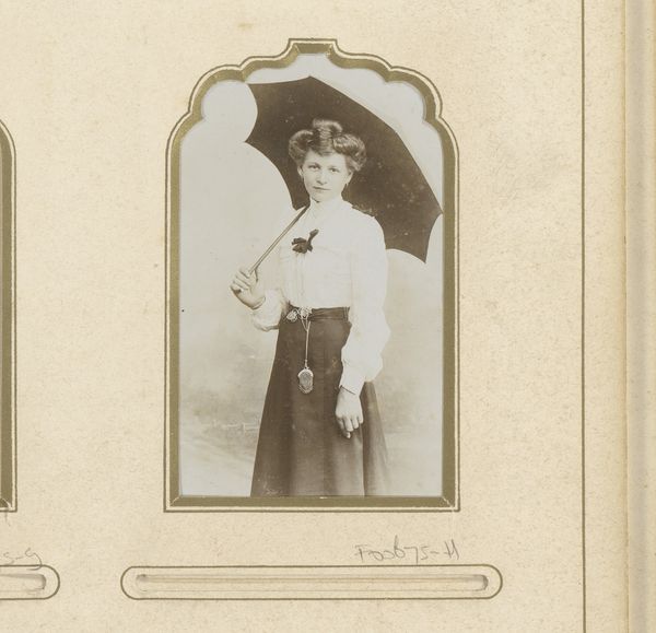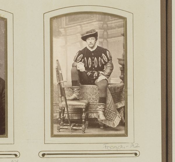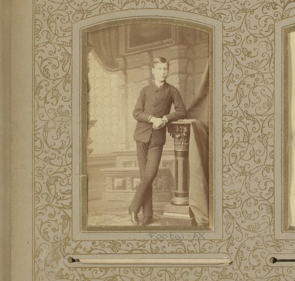 Curator: Looking at this remarkable daguerreotype, circa 1855 to 1870, by Delehaye & Sluyts entitled “Portret van een jonge man met cap, zweep, vlinderdas en sjerp”, what initially strikes you? Editor: The young man appears somewhat rigidly posed, almost theatrical. There's a stark formality in the arrangement of his attire and accoutrements. I’m interested in how those visual elements contribute to the overall effect. Curator: Indeed. Let’s consider the materials themselves. The daguerreotype, an early photographic process on a silvered copper plate, lends this image a distinct reflective quality. It captures the subject with remarkable clarity, particularly the texture of his clothing and the almost dream-like, muted tonality. Editor: And how might the materials of his clothing contribute to a reading of his social status? Notice the high collar and meticulously tied cravat. Also note the bowler hat—a seemingly casual item placed incongruously within a more formal setting. What sort of labor allows this presentation? Curator: From a formal perspective, observe how the diagonal sweep of his sash cuts across the vertical linearity of the backdrop and his posture. It creates a visual tension. Moreover, the symmetry in the image and how he balances in space offer additional insight. Editor: I’m wondering about that backdrop itself. It presents this idealised space behind him but that constructed world exists due to the labor of many individuals, most of whom won’t experience such treatment. He wields his riding crop confidently. We can read into that an expression of privilege afforded by a network of laboring individuals. Curator: Absolutely. And we mustn’t ignore the significance of the hat. It perhaps symbolizes a move towards industrialisation, yet is juxtaposed with an almost romantic presentation. It's almost as if these pieces are speaking back and forth with one another, arguing their meaning with placement. Editor: Right! And that hat, presented through the daguerreotype, suggests how quickly this new technology sought to embed itself within established social codes, offering the emergent middle class a potent new medium for self-representation. In some sense, a medium in conflict with its message, the materiality of it against the immaterial aspirations within the frame. Curator: Considering the intricate arrangement of details and formal decisions, there's so much for an eager art historian to consider about representation. Editor: For me, I want to know how each piece in that photograph reflects or rejects systems of labour as this technology became integrated in nineteenth-century Belgium. It suggests just how vital material considerations are for comprehending visual languages and social relations.