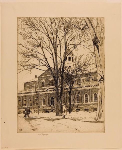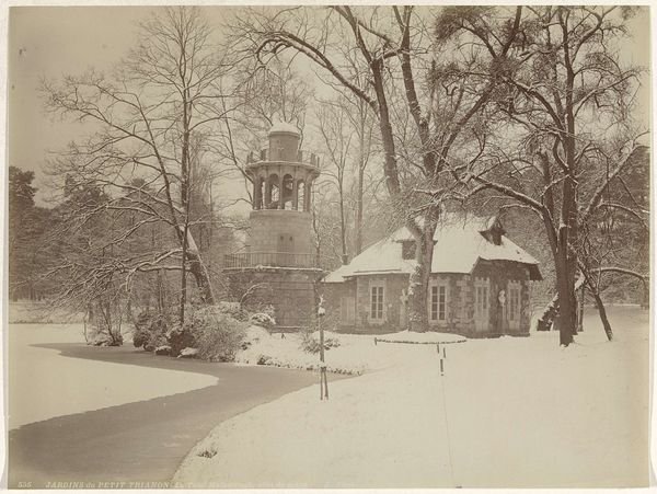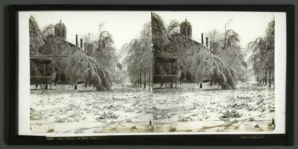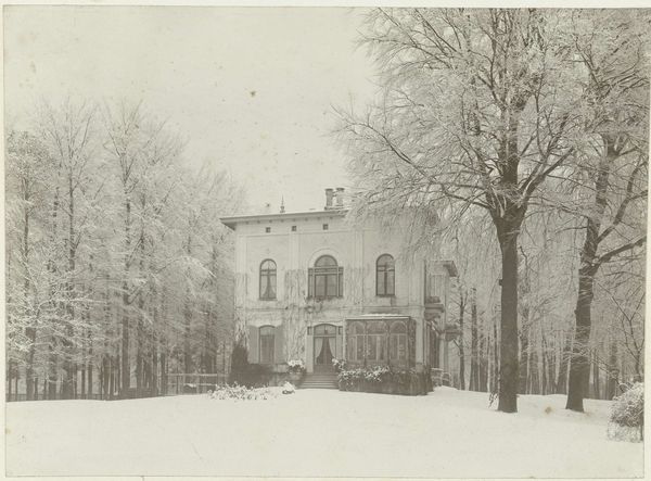Editor: This is a photograph titled "Geziicht op landhuis De Wildbaan, Driebergen, met sneeuw," which I believe translates to "View of the De Wildbaan country house, Driebergen, in the snow." It's by Henry Pauw van Wieldrecht, dating from 1903-1907, currently at the Rijksmuseum. It's quite beautiful, the snow really softens the architecture. What's your interpretation of it? Curator: The crucial aspect to observe is the process of its creation. We're seeing photographic print, likely manipulated during development or even in the darkroom. Consider the industrial processes involved, the mass production of photographic paper and chemicals that enabled someone like van Wieldrecht, an amateur, to make this image. The social context is key – who owned De Wildbaan? What was their relationship to the labor required to maintain that estate, especially in the cold winter? Editor: So you’re thinking less about the aesthetic quality of the snow, and more about the means by which the image was created and the societal structures it represents? Curator: Precisely. The seemingly innocent depiction of a snowy landscape hides a complex web of industrial production, social class, and labor. Think about the materials used – the silver halides in the photographic emulsion, sourced perhaps from colonial mines. And where would the photograph eventually reside? An album in an upper-class home, further reinforcing divisions between leisure and labour. How might an image like this justify those social conditions? Editor: That's fascinating. I hadn’t considered the wider material and social networks embedded within this seemingly simple landscape photograph. Thanks! Curator: And that reflection enriches our understanding of both the image, its impact, and photography's influence on class relations during that era.