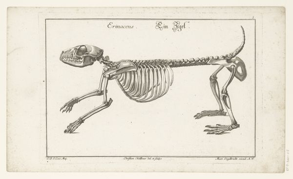 This print of a cormorant skeleton was made by Christian Hallbaur sometime in the 18th century using etching and engraving techniques. The stark lines and precise details were achieved by cutting into a metal plate, inking it, and then pressing it onto paper. The linear quality emphasizes the bones' structure, revealing the cormorant's anatomy with scientific precision. The meticulous process highlights the importance of skilled labor in creating detailed images for study and documentation during the Enlightenment. This was a time when scientific illustration was key to advancing knowledge. The print’s monochromatic palette directs our attention to the form and texture of the skeleton itself. By focusing on the material reality of the cormorant's remains, Hallbaur blurs the boundary between art and scientific observation. The image offers insight into a specific creature and the broader pursuit of understanding the natural world through careful study and representation.