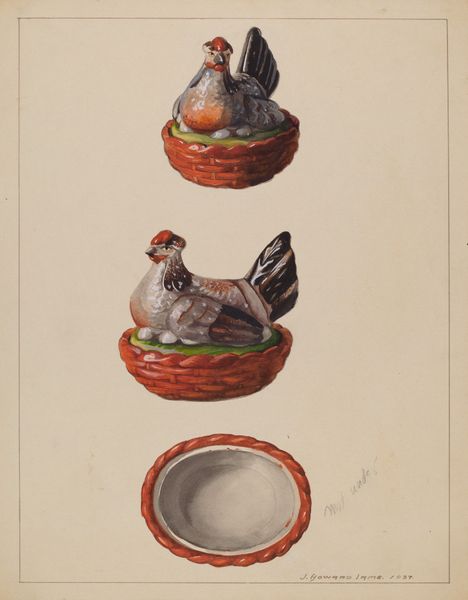 Curator: Immediately, I'm struck by the quiet stillness of it. The oval composition, the muted palette—it radiates serenity. Editor: I'm Robert Gilson, and I painted this, I think it's the mid-1930s work, a watercolor, pencil, and colored pencil drawing called "Hen on Nest." Curator: Motherhood, obviously. The protective hen, centered in the round nest, evoking cycles of life. Even the palette--the creamy whites and browns, they're the colors of nurturing, of the earth itself. Editor: Observe the geometry. The circular nest grounding the broader shape of the hen, creating formal unity. Even the faint pencil lines create a sense of texture. Curator: Is the symbolism exclusively maternal though? The hen, across cultures, represents more than just motherly love, it represents watchfulness, providence, sometimes even sacrifice. Think of folk tales and creation myths around the world, where a hen lays the cosmic egg, for example. Editor: Interesting perspective. Do you find a similar element in what may appear a mundane basket. Its texture almost organic, like interwoven branches. In effect, a formal exploration of rustic simplicity? Curator: I think it speaks to a deep yearning for connection, doesn't it? A visual embodiment of hearth and home. Perhaps in turbulent times, a comforting reminder of nature's enduring cycles. Editor: I had hoped it could serve to remind me how to be a human. After studying it and other of my artworks, the more clearly it shows you everything you cannot do! The colour harmony sings its melody still... Curator: This piece presents such intriguing possibilities, a delicate synthesis of technique and iconographic complexity that creates its simple power. Editor: Perhaps...the tension between simple subject and rich art theory! But in essence, my experience shows, if even momentarily, art speaks for itself..