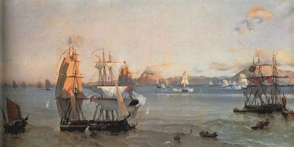 Editor: So, here we have William Bradford's "East River Off Lower Manhattan," painted in 1862 using oil paint. There’s a sort of calm, almost eerie, stillness to it with all these ships just… there. What stands out to you about this piece? Curator: Well, beyond the technical skill evident in Bradford’s rendering of the light and water, I'm particularly drawn to the context. Consider the date, 1862. The Civil War is raging. What does it mean to depict New York as a center of calm commerce during such turmoil? This image functions as a powerful, if perhaps unconscious, statement. Editor: A statement of what, exactly? Curator: A statement about the North's economic power and endurance. This painting becomes a form of visual propaganda, subtly reinforcing the idea that despite the conflict, life, and more importantly, trade, continues. Bradford focuses on mercantile activity instead of showing, say, military ships or soldiers. What kind of statement is he trying to convey, and who is his intended audience? Editor: So, it's not just a pretty picture, but a kind of… economic boast? It makes me wonder if that seemingly calm water is actually hiding a lot of anxiety about the war's outcome. Curator: Precisely. And who gets to participate in this "calm" commerce? Whose prosperity is being visually celebrated here, and at whose expense? Understanding that this scene is taking place against the backdrop of the Civil War and the economic inequalities of the time opens up new avenues for interpretation. It underscores how art can participate in and shape political and social discourse. Editor: I never would have looked at it that way, but it makes the image so much more complex and, honestly, interesting. Thanks for the insight. Curator: My pleasure. Seeing art as more than just aesthetics – as active participant in history - changes everything.