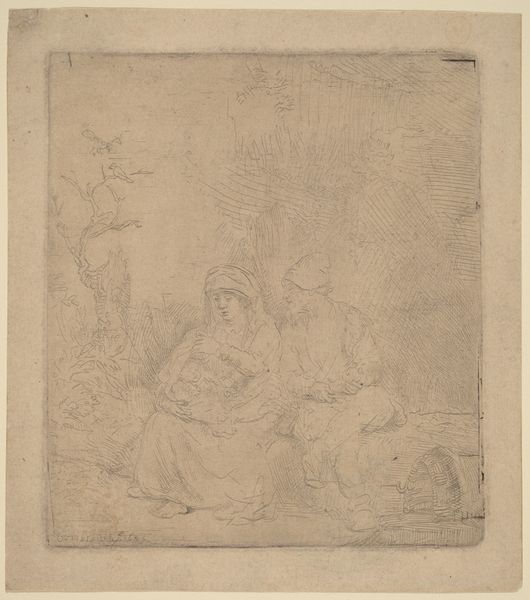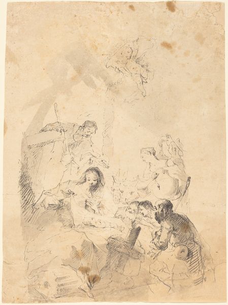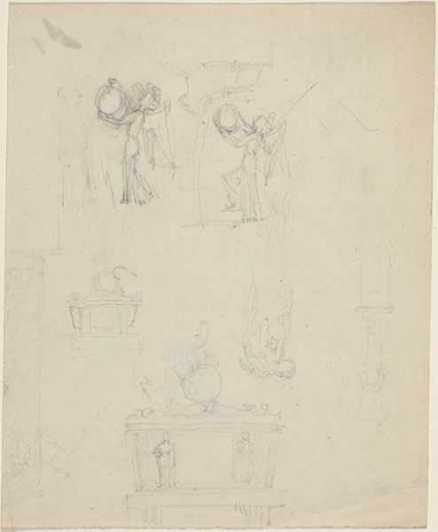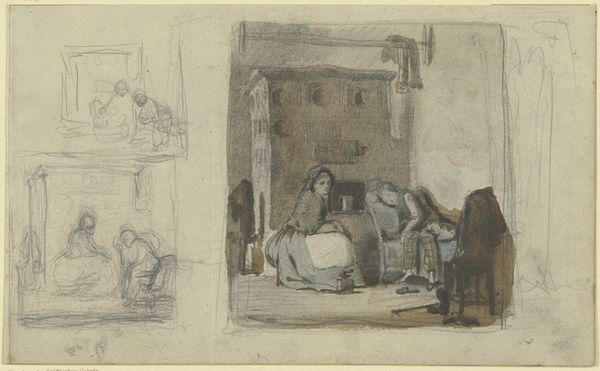 Curator: Hermann Gollner's pencil drawing on paper, "Studienblatt_ Familienszenen im Freien", presents a dual scene, a study really, of family life outdoors. I find it incredibly evocative of a bygone era. What strikes you immediately about this piece? Editor: The starkness of the pencil against the aged paper evokes a strong sense of memory, a fragile but resilient glimpse into intimate family moments. I’m also intrigued by how separate the two family groups seem; they feel almost like echoes, mirroring one another across time and space. Curator: Indeed, and considering the time he was working, such imagery of domestic tranquility would carry a potent message, a reminder of societal ideals amidst the upheavals. Note how Gollner uses delicate lines to delineate figures in these genre-painting scenes. This suggests the intimate interactions with the domestic space. Editor: The image on the right seems especially heavy with cultural symbolism. A woman surrounded by her children—it speaks to themes of protection, fertility, and continuation, powerful archetypes within many societies. The act of pointing implies a shared vision or goal passed down through generations. Curator: That reading absolutely resonates. Also, let’s not ignore the visual context within museums: exhibiting these intimate scenes serves to shape collective memories and perceptions of the family, subtly influencing social norms even today. The act of selecting and framing these images by institutions bolsters cultural power, subtly dictating the narrative around familial love and upbringing. Editor: I see your point. It’s not just about recording history but also about actively constructing and maintaining certain ideas about the family unit across time. But the vulnerability apparent in the raw sketch hints that, maybe the intention of the artist was to render these memories from an innocent perspective of his childhood. Curator: Undoubtedly a complex, nuanced contribution from Gollner. Editor: An ephemeral dance between representation and re-imagining, between individual memory and shared history, that keeps giving back to the visitor with every gaze.