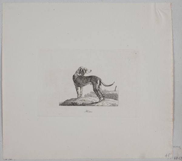 Christian David Gebauer made this etching of a dog, titled "Bello," at an unknown date. This print allows us to reflect on the changing relationship between humans and animals at the turn of the 19th century. Dogs moved from being working animals to domestic companions, particularly for the middle and upper classes of Europe. As such, the visual representation of specific dog breeds became associated with wealth, leisure, and the natural world. Further research would be needed to identify the dog's breed and potential symbolism. By looking at images in popular publications of the period, we might better understand how "Bello" participates in the social life of its time.