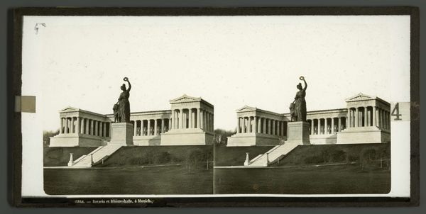 Curator: Today, we’re looking at a photograph by Georg Böttger, dating from around 1870 to 1885, titled "Standbeeld van Bavaria te München"—or, "Statue of Bavaria in Munich". Editor: My first impression? Grandiose and a bit austere. It's like looking at a memory, sepia-toned and monumental. That statue, perched high above the classical building...there's something strangely powerful about its stoicism. Curator: Indeed. The composition emphasizes a strong horizontal axis, punctuated by the verticality of the columns and the statue. This creates a balanced yet imposing visual rhythm, reinforcing the themes of civic pride and classical idealism central to Neoclassicism. Editor: Neoclassicism! See, I just get 'ancient gods are judging you' vibes. That building could be right out of ancient Greece. The statue, what’s she holding above her head? Victory wreath maybe? There's such a human element amidst all the rigid lines, isn't it ironic? Curator: Precisely, there is an intentional dialogue here. The subject, the statue of Bavaria, with its raised wreath of victory and familial lion, stands as a representation of strength. Positioned before an architecture clearly referencing antiquity, there is the attempt at legitimizing and celebrating contemporary Bavarian power through appeals to classical notions of governance. Editor: It works. There's this strange tension, though. The softness of the photograph versus the sheer stone-cold monumentality of it all. Plus, the emptiness around it... like she's guarding a secret, and daring anyone to try and learn. Curator: A fair analysis. As a photograph, its materiality presents a stark record. The monochrome flattens the form into an exercise in contrasting light and shadow, creating an iconic representation with complex symbolic implications. Editor: For me, it really encapsulates an era, it feels suspended in time. You can almost feel the weight of history and ambition embedded in those stones and on Bavaria’s expression. It's powerful, yet strangely detached. Curator: A wonderful synthesis of thoughts! Böttger's piece certainly makes us reflect on the power of imagery to embody not just places but entire epochs and the ideologies they represent.