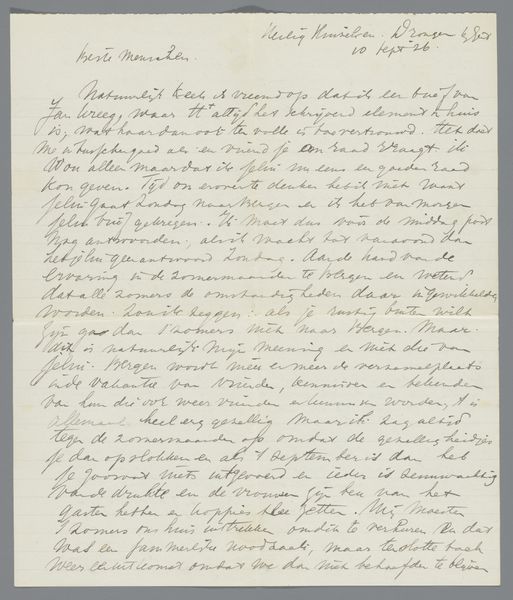 Curator: This is “Brief aan Pier Pander” by August Allebé, believed to have been created around 1894. The medium is ink on paper, showcasing a beautiful example of calligraphy. Editor: It feels delicate, almost fragile. The ink is faded in places, suggesting its age and handling. The texture of the paper looks quite smooth. Curator: Indeed. Allebé was writing a letter to Pier Pander, a Dutch sculptor. The content seems to be offering commentary on a sculpture that Pander was working on. We can tell from the date at the top—November 16, '94—and the salutation, “Waarde Pander.” Editor: It's fascinating how the act of writing itself becomes the art. The precision in the strokes, the flow of the sentences, it's clear he had the technical facility but also a keen eye for overall composition on the page. Is the production of these forms the means by which he establishes his view? Curator: Precisely. Calligraphy was regarded in high esteem for this reason, because it was deemed a high expression of cultural values at that moment. We can interpret it as part of a broader discussion on aesthetics of art and social status happening at the time, since correspondence would’ve also reflected levels of respect between individuals of varied importance, and the nature of the penmanship may have symbolized social affiliation at the time as well. Editor: Looking closer, the handwriting is so elegant. One can consider how something like a letter becomes an intimate, tactile form of communication in a pre-digital era, which obviously highlights different kinds of material production. Curator: It gives insight into Allebé's thought processes, both about artmaking and his relationship with Pander. The fact that he took the time to handwrite this detailed letter speaks volumes about the artistic and social relationships of the period. Editor: Well, analyzing the details of these kind of processes definitely deepens the engagement with it! Curator: Agreed. Appreciating its cultural and social contexts enables a greater understanding. Editor: I am fascinated by it’s material expressivity and how it becomes an intellectual form through the pen strokes.