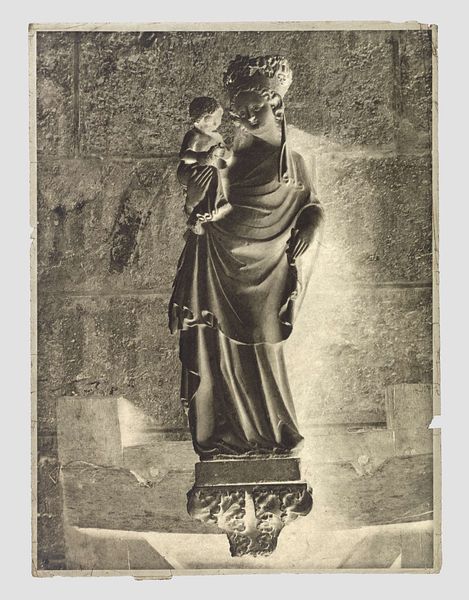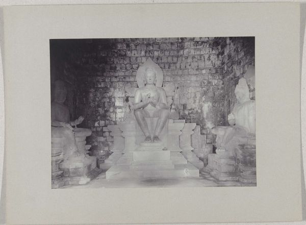 Curator: Here we have a gelatin-silver print taken sometime between 1895 and 1915, attributed to Onnes Kurkdjian. The piece, titled "Beeld van een van de twee koningszonen in de Tempel Mendoet ten zuiden van Magelang, Nederlands-Indië," depicts a sculpture in, as the title suggests, the Mendut Temple. Editor: Whoa, talk about a mood piece. It's got this eerie, almost ghostly vibe, doesn't it? The sculpture looks solid, eternal, but the faded black and white and the rough edges of the photo make it feel like it’s a forgotten dream. Curator: The photo itself serves as a cultural artifact, a kind of document that also reveals much about Dutch colonial interest in the region, immortalizing the temples in image. The artist plays with the contrast, focusing mainly on the serene face, and directing us away from the hands held in symbolic gesture. Editor: Absolutely. I am drawn to his pose. Sitting, so self-contained. And the wall behind him—those ancient bricks feel like they’re whispering stories, if that makes sense. Is this image really history, a relic of the past, or an invitation to look inwards at our own human foundations? Curator: Both, I think. Buddhist iconography in general—the lotus position, the mudras—always asks us to engage our own contemplative, historical, and psychic states, connecting this serene and unknowable king’s son to larger principles. This representation in stone certainly resonates on levels beyond historical documentation. The gesture alone invites one in. Editor: Right? I love the play of textures, too. The smoothness of the stone sculpture against the rough brick, then the way the photographic grain sort of unifies it all. You said "serene" earlier... to me the photo teases with both, that sense of calm, but also this gnawing feeling of something being lost to time. Curator: Perhaps that feeling of loss you mention is what gives the portrait of a sculpture its emotional resonance for a modern viewer. Editor: Exactly! Well, either way, this king’s son has got my imagination running wild. Curator: Indeed. It’s a powerful photograph, one that allows us to contemplate deep cultural and historical meanings within the delicate bounds of captured light and shadow.