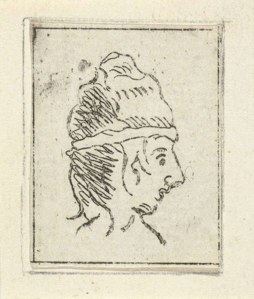 Curator: Jacob Hoolaart, a Dutch artist, likely made this drawing titled "Vrouwenkop" sometime between 1728 and 1789. It is executed in ink on paper. What strikes you when you see this image? Editor: It's remarkably economical, isn't it? The fewest possible lines to convey form, texture. The subject has a pensive air. I’m intrigued by the graphic impact achieved with such simplicity. Curator: Absolutely. The era saw increased portraiture's significance reflecting emerging societal shifts. Hoolaart likely catered to a burgeoning middle class keen on personal representation. The loose lines perhaps signify a move away from the rigid formality of aristocratic portraiture. Editor: Look at the placement of the lines around the headscarf and the suggestion of the drapery! It creates volume and depth, almost implying an ethereal glow, despite the starkness of the ink. There’s something incredibly skillful about that economy. Curator: The placement of such images within the domestic space reinforced emerging ideas of individualism and privacy. Portraits became tools for constructing and broadcasting personal identity. What about the gaze? Editor: The gaze is directed away, internal. The use of line suggests shadow under the eye, a subtle yet powerful indication of mood, implying the figure's deep in thought, perhaps even melancholic. Curator: And think about the rise of the printing press, fostering broader artistic dissemination, particularly within the Netherlands during Hoolaart’s lifetime. These portraits also served political ends – forging connections and promoting shared ideals among an increasingly connected populace. Editor: It's fascinating how just a few strokes create not just form but also an atmosphere. It begs the question, doesn’t it, what we choose to reveal—or conceal—through such visual parsimony. A perfect example of the maxim, less is more. Curator: Indeed, this simple yet evocative drawing allows us to peer into both individual likeness and a particular societal milieu. Editor: I'll never look at a simple line drawing the same way again. It’s a testament to the expressive potential within even the most austere formal means.