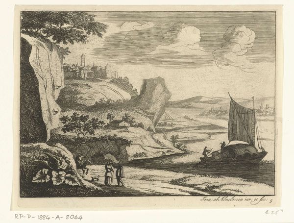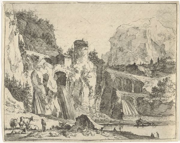 Editor: This etching, "Mountainous Landscape with Column," dating from the late 17th century, is the work of Roelant Roghman. It's interesting; the landscape seems so wild and untamed, and yet there's this very formal column placed rather prominently. What do you see in this piece? Curator: Well, it feels like a journey, doesn’t it? Roghman leads us on an adventure, but it's not all rugged beauty. The column, this classical element, is so deliberate. It’s like stumbling upon a memory, a ruin perhaps, amidst the sublime, almost threatening wilderness. Maybe the column is Roghman reminding us that even in the face of nature's grandeur, humanity leaves its mark, literally and figuratively. Or maybe it is not the sublime at all. A good drawing, like this, is open-ended, it depends where we're standing and how we look at the image. It becomes a mirror, you see yourself. Editor: That's fascinating! The column as a marker of human presence… I hadn’t considered that. So, would you say this juxtaposition between the natural and the man-made is the key to understanding Roghman's intention? Curator: "Intention" is always tricky, isn't it? As artists, we rarely fully grasp it. But yes, that interplay is crucial. Think about how often we seek order in chaos, how we try to contain the uncontainable. Roghman has this beautiful way of weaving them together to allow some air to flow through. What do you take from the atmosphere, its tonality? Editor: I get the feeling that it’s about exploring the world, and appreciating what we discover – and bringing these aspects with us. It feels a bit philosophical, a little open. Curator: Exactly! Roghman invites you to be a wanderer, a dreamer in ink. Each line, scratch, smudge can allow our own self and context to blend in, creating unique narratives, where old meets new and then continues in your own life. What an amazing connection to make with people across all these eras. Editor: That makes me appreciate this a lot more. It's not just a landscape; it's an invitation. Curator: It is indeed. Art that truly speaks always is!