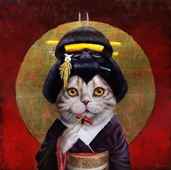 Editor: This is "Scorpio" by Lucia Heffernan, a painting depicting a cat dressed in formal attire. The cat has a rather serious, almost human-like expression. What stands out to me is the contrast between the formality of the attire and the inherent playfulness we associate with cats. What’s your take on this piece? Curator: I see a clever commentary on social constructs and the projection of human traits onto animals. The cat, adorned with a top hat, monocle, and bow tie, becomes a satirical representation of the upper class, or perhaps even human vanity itself. Do you notice how the backdrop also contributes to this? Editor: You mean the constellation and the celestial background? I hadn't thought of it that way. Curator: Precisely! Consider the historical context. Portraits, especially of the elite, often included symbols of status and power. By placing a cat in this traditionally human setting, and embedding the Zodiac sign, Heffernan is poking fun at our own self-importance and perhaps alluding to how we use astrology, which historically was associated with kings, to find order in a chaotic world. It makes me think, how much of our identity is really of our own making versus constructed by society? Editor: That's a great point. It really makes you question the way we present ourselves and the roles we play. So the humour is a device for social commentary. Curator: Yes! The cat isn't just a cute animal; it becomes a vessel for exploring themes of social class, identity, and even our relationship with the natural world. How are animals depicted in a gallery setting versus pets depicted at home? The institution of the gallery can alter one's perception, as well. Editor: That’s fascinating! I’ll definitely look at portraits differently from now on. Curator: Indeed! And hopefully consider how context and institutional power can change our perspectives.