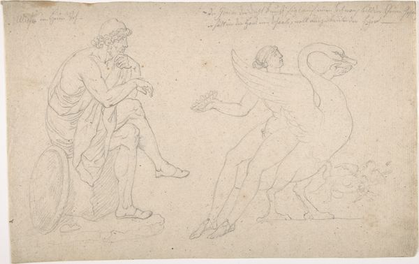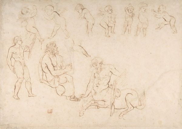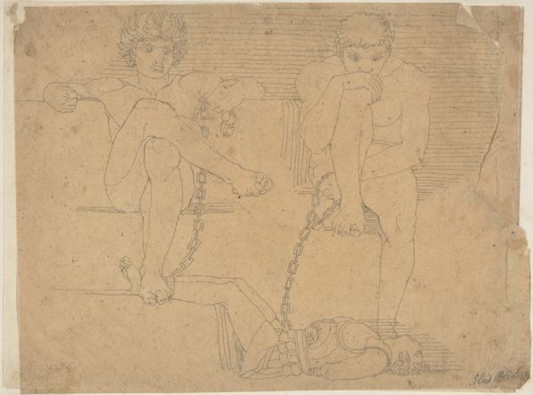 Editor: This is Jacques-Louis David’s "Three Nude Male Bathers," from his Roman Album. It’s a simple sketch, but the figures feel so alive. What can you tell me about it? Curator: The means of production are crucial here. David's rapid sketch points to his understanding of the body as a commodity, transforming flesh into lines with economical efficiency. What does it say about labour when the male form is so readily consumed? Editor: That’s a fascinating perspective. So you're looking at how David's technique reflects a social attitude? Curator: Precisely. The ready availability of classical forms, filtered through David's hand, makes visible the artistic and social consumption practices of his time. The ease of reproduction inherent in a sketch facilitates broader circulation and potential commodification of both the image and the ideal it presents. It makes you wonder, how did these sketches function in the broader art market? Editor: I never would have thought about it like that. Thanks.
