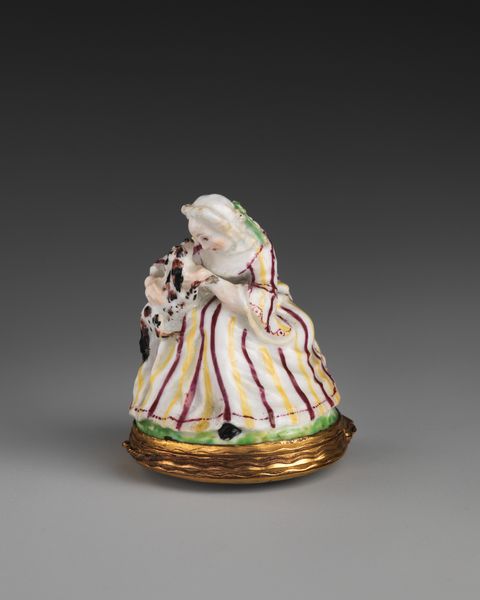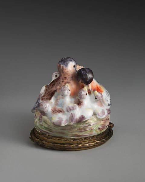 Curator: Here we have a "Bonbonnière" created between 1751 and 1761 by the Chelsea Porcelain Manufactory. The piece, a delicate porcelain sculpture, resides in the Metropolitan Museum of Art. Editor: It's undeniably charming, with this mother bird protectively nesting her young! I am really struck by the details around its small, compact size. It appears very fragile! Curator: It certainly is. "Bonbonnière" is French for a candy box, and objects such as these, often elaborate, were popular among the upper classes during the Rococo period. Editor: It's interesting to see such emphasis on domesticity and family presented within a luxury item. How complicit were such objects to existing societal conventions around women's perceived place within the home? Curator: That's an important perspective. Objects like these also showcased the incredible skill of the artisans involved. Chelsea porcelain was highly prized. These artisans used considerable labor to master the techniques required to mold and paint the porcelain into such intricate shapes, so it became a status marker. The factory's location near London also meant it was part of a burgeoning culture of consumerism. Editor: I imagine these were intensely collected. Were their aesthetic choices also rooted in existing power dynamics? What does the almost romantic vision of a bird's nest gloss over? Is there also a power dynamic implied between humans and animals within the sculpture, especially given its function as a vessel? Curator: The Rococo style celebrated ornamentation and lightheartedness, qualities embodied by the pastel colors and the detailed naturalistic elements. Such delicate works played a role in aristocratic social rituals. The giving and receiving of sweets, displayed in pieces such as these, would be moments of social exchange. Editor: Looking at this "Bonbonnière" invites us to unpack social rituals, craftsmanship, class, and gendered expectations. It really does show that seemingly frivolous objects carry significant cultural weight. Curator: Absolutely, this piece represents a unique point in history, embodying luxury and skill within a changing society. Editor: Examining an object such as this demonstrates the intertwined relationships between art, society, and identity. I feel deeply provoked by the implications behind it, as it brings so many factors to the forefront.