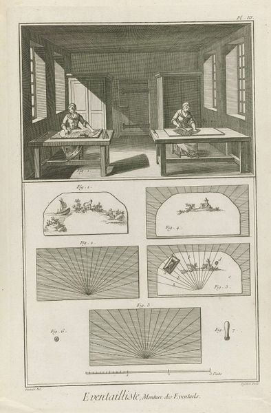 This is a page from Denis Diderot's "Recueil de planches," an 18th-century compendium of knowledge, part of his broader "Encyclopédie." The image presents the craft of fan making, and it offers us a glimpse into the lives of working women during the Enlightenment. While the Encyclopédie aimed to classify and celebrate human knowledge, including artisanal skills, it also inadvertently reveals the gendered division of labor. Here, women are depicted engaged in meticulous, repetitive tasks, underscoring their roles in production, yet also subtly highlighting the limitations placed upon them in a patriarchal society. Notice how the detailed illustrations show the stages of fan design, and how the labor is divided. What the image doesn't depict are the social hierarchies and economic disparities inherent in this system of production. The page then is not just a record of craft, but a reflection of the complex interplay between labor, gender, and knowledge in 18th century France.