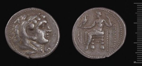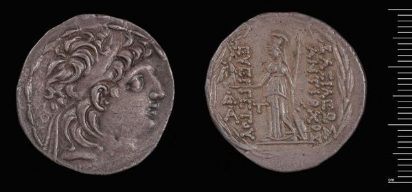 Editor: This is a Tetradrachm of Antiochos VIII and Cleopatra. What strikes me is how the two faces seem almost melded together. What do you see in this piece? Curator: Coins such as this one become potent symbols, not just of rulers, but of complex relationships. The conjoined portraits speak to a dynasty, but also to the power dynamics inherent in a royal marriage. What visual cues tell us about their roles? Editor: I guess the way they are presented together suggests unity, but also potentially hints at hidden tensions, like a power struggle? Curator: Precisely! Consider how cultural memory might have shaped the understanding of such imagery. What stories were circulating, and how did this image reinforce or challenge them? Editor: It's fascinating to think how much meaning could be packed into such a small object. Curator: Indeed. It's a reminder that even the most mundane objects can carry significant emotional and political weight.