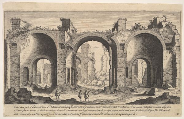 Curator: Right now we are looking at “Ruins with Arched Vaults, from the series Roman Ruins and Buildings,” an engraving by Johannes van Doetecum I created in 1562. What is your first impression? Editor: Crumbling. Hauntingly beautiful, yes, but absolutely crumbling. Look at how nature is slowly reclaiming what was once a symbol of power and order. Vines creeping over the arches, plants sprouting from the stonework… it feels like time itself is breathing down my neck. Curator: That's quite evocative. Decay is definitely a central theme. Ruins like these were potent symbols for 16th-century viewers, prompting contemplation on the transience of earthly power and the cyclical nature of history. The Romanesque style itself carries so many connotations. Editor: Absolutely! And it makes you wonder, doesn’t it? What stories these stones could tell, if they only could. Those tiny figures in the foreground—they look so small, so insignificant against this backdrop of fallen grandeur. They could be anyone, anywhere, just trying to find some shelter among the ghosts. Curator: Perhaps reflecting the era’s obsession with the rediscovery of classical antiquity. See how the artist has captured the scale of the ruins. It suggests a sense of awe, maybe even intimidation. This engraving would circulate among scholars, artists, and collectors, feeding a renewed interest in Roman history and architecture. Editor: The light's fantastic too! The way it hits those broken edges, carving out the texture… it is beautiful in its sadness, like an old black and white photograph, holding secrets you wish you could unravel. It also gives depth into the place like if it was infinite, as ruins always make you wonder about this feeling of vastness and the absence of boundaries... Curator: An apt observation, considering that prints like these facilitated the dissemination of ideas and visual culture. The arches as well bring up the Roman aesthetic, the repetition, their geometry in the middle of natural, organic desolation of the plants growing above the top. Editor: Yeah... This print captures a dialogue, doesn't it? A silent but forceful discussion between nature, history, and us—the observers standing at the edge of time. Curator: Indeed, and a reminder that even the mightiest empires eventually return to dust. Editor: Right, thanks to Johannes van Doetecum for sharing that reflection!