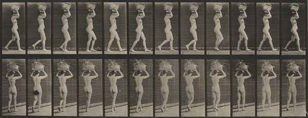 Curator: Eadweard Muybridge’s “Plate Number 34. Walking and carrying a 15-lb. basket on head, hands raised,” created in 1887. It presents a figure in sequential motion, quite clinical and detached, wouldn’t you agree? Editor: Detached, yes, but with an underlying tension. I find it somewhat dehumanizing, this stark portrayal of a body reduced to a set of mechanical actions, particularly given the loaded context of labour and gender. Curator: Precisely! Muybridge was invested in the scientific recording of movement, dissecting the human form into discrete units of time and space. Note the meticulous grid behind the subject, and the repeated capture of the same model, emphasizing objectivity. Editor: Objectivity, perhaps superficially. The history of photography is inextricably linked with power dynamics. Who is being observed, and for what purpose? This series reduces the woman to a mere subject for scientific study, stripped of agency and identity, with a heavy basket placed on her head. Curator: One might argue he was simply showcasing the mechanics of balance and motion. The raised arms, the shifting weight, the subtle adjustments. Observe the beautiful arc formed by her body as she transfers the weight of the basket through space. Editor: And yet, these ‘mechanics’ were, and continue to be, intrinsically connected to societal expectations and divisions of labour. Where and how can this “Plate Number 34” fit into feminist discourse? Are we analyzing the aesthetics or critiquing the objectification inherent within its photographic practice? The question stands: How can historical analysis of the body intersect with critical contemporary practices? Curator: Fair points. I will still stand with my idea that from a structuralist point of view, what draws me in is the very formal organization: the repetition, the sequencing, creating a visual rhythm that transcends the mere subject. It becomes about form and pattern rather than individual experience. Editor: Perhaps it’s that very tension between objective form and subjective experience that makes this image so compelling, so enduring, as we come away grappling with its social commentary within the semiotics. Curator: Indeed. The work reveals more when both voices contribute. Thank you! Editor: Thank you, it was important to see it in a different context.