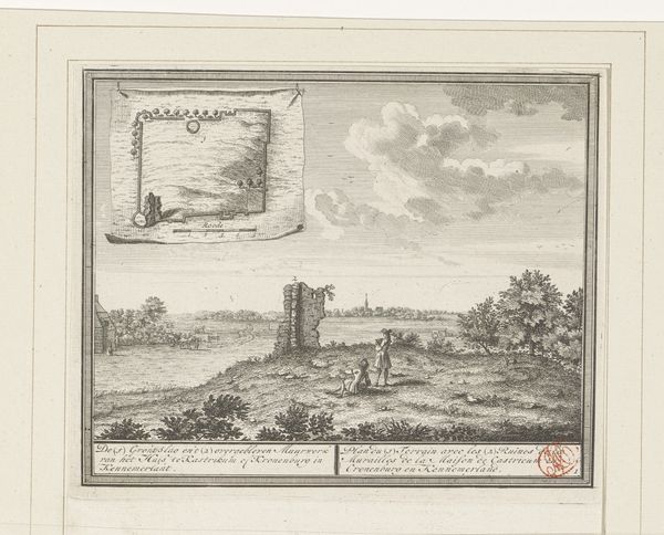 Editor: This etching by Jacobus Schijnvoet, titled "View of the Ruins of Voorne Castle in Oostvoorne," was made in 1711. The composition is striking; these architectural ruins dominate the flat landscape. It’s quite bleak, almost desolate. What strikes you about this piece? Curator: The desolation you observe is key. Prints like these served an important public function. Consider the context: 1711. What messages were being sent when artists chose to represent decay so vividly? This isn’t just a record of a place. It evokes ideas about time, loss, and perhaps even national identity. Note how figures casually inhabit the ruin – what do you make of this interplay between figures and architecture? Editor: They seem almost indifferent to the ruins, like it's just another part of the landscape. Almost like they’re reclaiming the space… Curator: Exactly. They are domesticating the imagery. This could suggest a shifting cultural attitude toward the past. Rather than seeing ruins as tragic reminders, they become integrated into the present, normalized. What could that imply about the public’s view of power structures and social change? Editor: That maybe power isn't permanent? These ruins, once symbols of authority, are now picnic spots. That says a lot about societal evolution, about the temporary nature of everything... Curator: Precisely. Schijnvoet's work opens a window into how people understood history and their place within it, prompting dialogue on power, ruin, and everyday life. Editor: I never considered landscape as a vehicle for such powerful social commentary! It really makes you wonder what other messages are hidden within seemingly simple images. Curator: And that's the magic of art history! There's always a story waiting to be uncovered, revealing more about ourselves and the societies we inhabit.