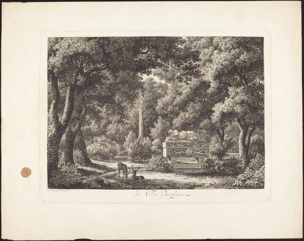 Curator: This etching from 1794 by Jacob Wilhelm Mechau captures a bucolic scene: "Fontana Blandusia, volgarmente detta Acquoria a Tivoli". It’s quite a mouthful, isn't it? What springs to mind when you first see it? Editor: A deceptive stillness. At first glance, it seems peaceful, idyllic. But there's a roughness to the etching, a labor evidenced by all these precise tiny marks... it makes me wonder about the lives depicted. Curator: The setting itself, Acquoria in Tivoli, lends itself to such impressions. The "Fontana Blandusia," refers back to Horace's poetry, evoking classical simplicity… but you’re right. There’s labor depicted at every scale, both in the artwork’s creation, using ink and pen and through the printmaking process, as well as the farming activity on display within the frame. Editor: Exactly! Think about the ink itself, the quality, how consistently it flows, how the artist controls the marks. And those cows! They dominate the foreground – not as romantic emblems, but as beasts of burden, really at the center of this material existence. I imagine the pen-and-ink lines are mirroring the furrows plowed in the fields. Curator: I love how you draw that connection. To me, this is also a sort of idealized realism. Mechau is using line to evoke volume and weight – there's a sensuality to the rendering, an awareness of light, even when constrained by the monochromatic palette. Do you think the "history-painting" tag accurately captures its qualities, though? Editor: "History-painting" seems a bit grand. This is less about epic narratives and more about documenting a way of life connected to the land. Even the act of observation is material. It feels like Mechau understood the physical effort required to make both art and sustenance. The texture created by the etching embodies work. Curator: That's a compelling argument. He definitely draws attention to the practical aspects, doesn't he? There's a humbleness here, a focus on the everyday—a fleeting, intimate look into this place. Editor: And hopefully, the process itself adds layers to our appreciation. Knowing it's an etching, that this scene was painstakingly reproduced... it enriches the image. I now feel a need to examine my consumption, both literally and figuratively. Curator: Wonderful. For me, that deep dive revealed the human connection—a universal thread.