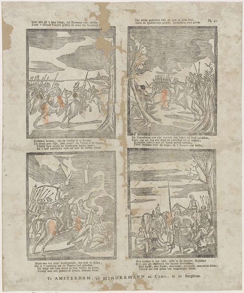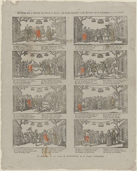 Editor: We're looking at "Kinderen hier zijn de vier staten der menschen / Welke denkt gy nu best voor u zelven te wenschen?" a print, an engraving to be exact, made by Johannes (II) Kannewet between 1725 and 1780. It's comprised of four panels each depicting a stage of life and their challenges, a sort of memento mori, I think? How do you interpret this work through a formalist lens? Curator: The division into four distinct quadrants immediately structures our visual analysis. Each panel operates as a self-contained unit, yet contributes to the whole. The lines are the dominating element, delineating forms and defining space. Note the consistent use of line – it lacks modulation, creating a flat, almost graphic quality across the entire print. How does that impact your experience of the piece? Editor: It makes the artwork seem… simpler, despite the details in each quadrant. Curator: Precisely. This linearity encourages us to read the image conceptually, rather than merely observe its mimetic qualities. Consider the visual weight of each section. Is there a balanced distribution of dark and light? How do the varying densities of the engraved lines influence our perception of depth and form within each scene? Editor: The top two panels seem brighter than the bottom two because there is less hatching overall. That makes sense given the subject, that the upper stages of life are supposedly "lighter" with fewer worries. Curator: An astute observation! And it is through such minute consideration of the formal elements, of line, composition, and distribution of tone, that we begin to unravel the structure embedded in this early print. Considering what we discussed, is the artistry residing only in subject matters, or the structural compositions in visual formation? Editor: Definitely both, but more about visual presentation overall. Thanks. Curator: My pleasure. It’s in the interplay of such formal elements that the power of visual art truly resides, regardless of its explicit subject.
