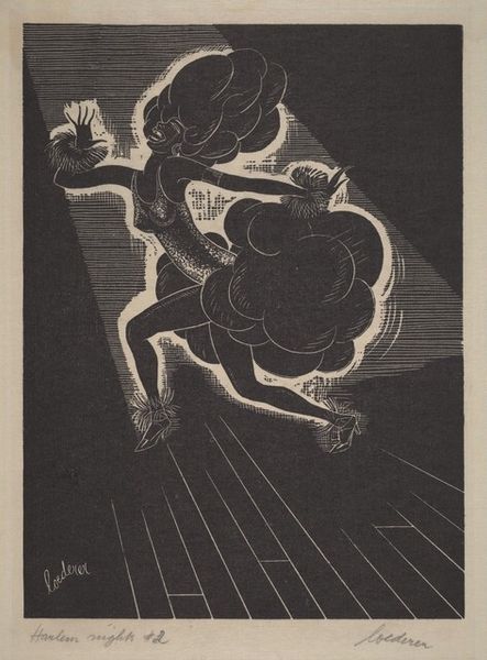 Curator: My first thought seeing this artwork is simply “intense”. The skeletal figure combined with such deliberate lines makes for a striking impression. Editor: We're looking at "Song of Warning and Annunciation," a woodcut print created around 1929 by Stanislaus Szukalski. He worked across sculpture and drawing but this work typifies his graphic output. It feels steeped in symbolism doesn’t it? Curator: Absolutely. Notice how Szukalski rendered the skeleton not just as a symbol of mortality, but as a vessel of something else entirely. What do you make of the small architectural structure atop its head, almost like a bizarre wig? It suggests intellect or ideology weighing heavily, perhaps to the point of death? Editor: I see that too. For me, it also resonates with the interwar period it was produced in – that is, the years just after World War I – with a pervading sense of dread and uncertainty about the future and anxiety about Europe. Even the starkness of the black and white amplifies the emotional weight, almost shouting out its warnings, which clearly has political ramifications for the artist’s anxieties. Curator: That makes sense in how symbolic visual language builds an iconographic weight for a culture’s memories. It's as if Szukalski distilled anxieties and cultural fears into a single, potent image. Note the intricate patterns on the skeletal frame and the surrounding objects: the visual language of premonition. Do you feel like Szukalski, then, also seems to be warning us? Editor: Yes, because consider his biography. He wanted the piece to connect across cultural epochs—melding ancient and futuristic fears into the very now of the artwork as well, implicating our cultural conditions in the symbolic collapse represented here. The whole composition pushes at ideas of a shared history of warning… Curator: It's powerful how the skeletal figure remains unsettlingly contemporary, making those warnings continue to feel relevant. A perfect representation of shared trauma! Editor: Indeed. For all its darkness, there's something compelling about its capacity to reveal threads connecting cultural pasts and futures, even if the threads are made of shared fear and anxiety. Curator: Well, considering that, I'll never look at this stark woodcut quite the same again. Thank you!