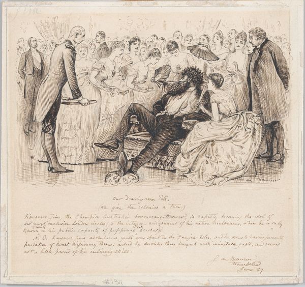 Editor: This wood engraving from 1867 by Winslow Homer is titled "A Parisian Ball - Dancing at the Casino." There's so much going on! I’m drawn to the way Homer captures the energy and spectacle of this ballroom scene, but there’s also a feeling of social observation, maybe even a touch of satire. What do you see in this piece? Curator: I see a layering of cultural memory, a record of ritualized social interaction, coded in visual language. Consider the setting, a casino, a space already loaded with the symbolism of chance, risk, and reward. And then, the dance. The swirling skirts, the fixed gazes… What do these repeating visual elements evoke for you? Editor: It makes me think of codified interactions. Like, there are all these unspoken rules, about who dances with whom, who observes, who is being observed. It's like everyone's performing a role. Curator: Precisely. Look at how the men in the background are visually grouped; some are watching the dancers, while others are absorbed in their own conversations. The contrast between movement and stillness. Think of the ‘danse macabre’, or dances of death, that we find represented from the medieval period onward – skeletons dancing as allegorical figures that reference plague. Could Homer, even unconsciously, be drawing from a deep well of visual symbolism? What emotional weight might these associations have lent to this image for viewers in 1867, just after the American Civil War? Editor: I hadn't considered those connections. I see how Homer uses these repeated figures and motifs, like the hats or the rows of faces, almost like a visual shorthand for the whole of society. Curator: The visual symbols convey collective identities and shared cultural understanding. And the very act of viewing such an image reinforced social bonds within a readership. It makes one think about our own visual consumption today – do we share a similar sense of collective experience, or is it now fragmented? Editor: That’s fascinating! I came in thinking about Impressionism, but now I’m leaving with all these connections to historical and cultural symbols. Thanks for sharing your insight!