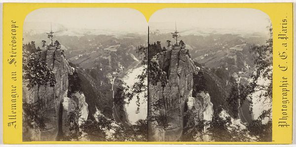 Curator: Welcome. Today we’re looking at an intriguing image by Charles Gaudin, "View of the Bastei and the Elbe Valley, Germany," likely taken between 1860 and 1870. Editor: My initial impression is one of serenity tinged with monumentality. Those stark rock formations amidst the soft forest landscape are so striking. And that ethereal, almost painterly quality... incredible for photography of that period! Curator: Indeed. What's remarkable here is this gelatin-silver print offered as a stereoscopic image. Considering its social context, it allowed for mass consumption of visually impressive and rather romantic landscape scenes through cutting-edge technology. Editor: It makes you think about labor and accessibility too. Producing and circulating images like this, though photographic, involved craft—skilled darkroom work, choice of materials… it’s not a straightforward industrial process as some might assume. How were these landscapes received? Curator: Well, remember that during this period, photography was increasingly utilized by middle classes keen on collecting views and landmarks from Europe; the stereoscope became a hugely popular viewing device for consuming such scenes, domesticating them into bourgeois households as keepsakes or signifiers of cultural knowledge. Editor: And isn't there an inherent politics of imagery in selecting *this* scene? This romantic view caters to and perhaps constructs a very specific perception of German national identity tied to an appreciation for natural grandeur. The very act of its mass production altered the reception of "nature" itself. Curator: Certainly. And the framing... isolating those particular rocks in the valley… that reinforces an ideal rather than an objective truth, manipulating the viewers understanding of both German topography and Romantic sentiment at play during the period. Editor: Reflecting on its making and reception reshapes our own view. Seeing this today, it’s a meditation on the construction of vision, of memory, and on the commodification of idealized landscapes as tokens of power and pleasure. Curator: Precisely, and perhaps considering its materials allows one insight to question its permanence as opposed to its message, prompting engagement beyond immediate sensory experience.