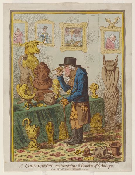 Curator: Here we have "Interieur met vogelconcert," or "Interior with Bird Concert," an early piece believed to be by Cornelis Saftleven, dating sometime between 1620 and 1715. It is rendered in coloured pencil. What strikes you initially about this artwork? Editor: My immediate thought is organized chaos! There’s something delightful yet unsettling about this…assembly? A room with all manner of objects and a motley choir of birds taking center stage. It feels like a satire but of what exactly, I wonder. Curator: Precisely! The beauty is in the disarray. Consider the formal arrangement, how the composition juxtaposes darkness and light to guide our focus. See the musical score propped up, around which owls and other birds gather. Note how Saftleven's caricature hints at foolishness through animal figures aping human behavior, echoing common themes in Dutch Golden Age painting. Editor: There’s such a peculiar joy in observing the contrast, isn’t there? A proud rooster perched above, seemingly conducting this…discordant avian chorus. And the little man peering out from behind the yellow drapes! It's utterly absurd but it really asks us to think: what is Saftleven communicating about our human foibles through the metaphor of this concert? Is the work a playful dig at artistic skill, mocking an opera's supposed dramatic skill? Curator: Yes, look closely at the color work – gentle and light yet surprisingly adept at defining space and form. The materials and tonal consistency are especially well handled; each object and creature has an almost tangible presence. The details almost disappear until you step closer to inspect each feather and facial expression! Saftleven's skill in capturing this satirical genre is a stroke of subtle genius. Editor: In this madcap ensemble, what stays with me most is the picture’s power to spark questioning and reflection. To consider how Saftleven, through careful observation, helps us find laughter and thought-provoking irony in a room full of birds. It's a funny thing when feathered creatures can become our mirrors. Curator: Indeed. Art, in its humorous way, nudges us to reflect, and even critique, elements of our world—rendering us all students in Saftleven's imaginative classroom.