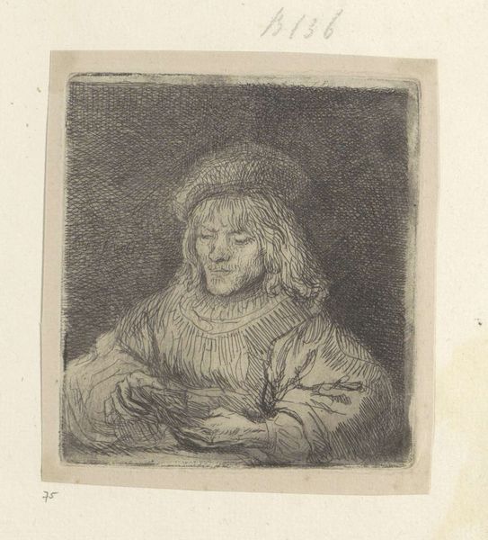 Curator: Ferdinand Bol’s drawing, "Woman in Window with a Pear," showcases the artist's skill with humble materials. Look at the textures he achieves with simple graphite on paper. Editor: The woman's gaze strikes me—it feels like defiance, or perhaps a quiet resilience, in the face of societal expectations for women of her time. Curator: Bol was interested in portraying the human form through a manipulation of light and shadow, and through a material understanding of form. This method reveals class distinctions, visible labor, and access to resources. Editor: It's difficult not to consider the female gaze here, and how it pushes back against the expectations and limitations placed upon women during that period. Curator: Right, and by understanding the processes by which the work was made, from its materials to how it’s displayed, we gain insight into the culture that made it possible. Editor: Absolutely. It's through considering the historical, social, and political context that we can really unearth the power dynamics at play.